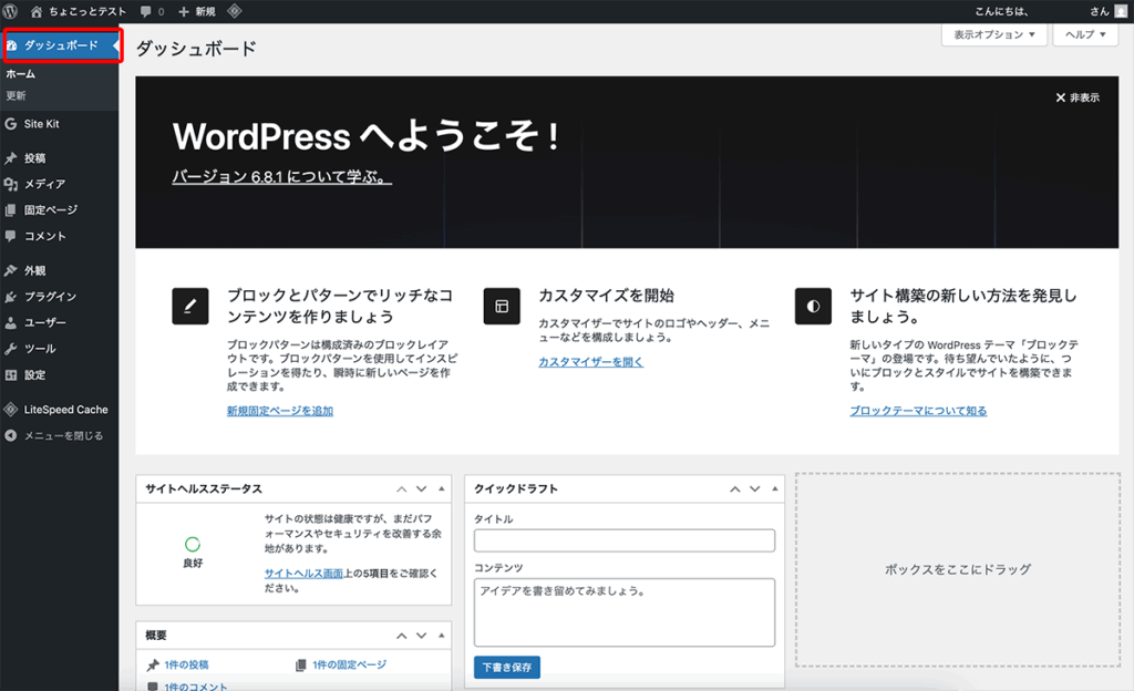 ログインすると、画像のような画面が表示されます。ここがWordPressのコントロールセンター。投稿の作成やサイトの設定、デザインの変更など、あらゆる管理作業ができるようだ。