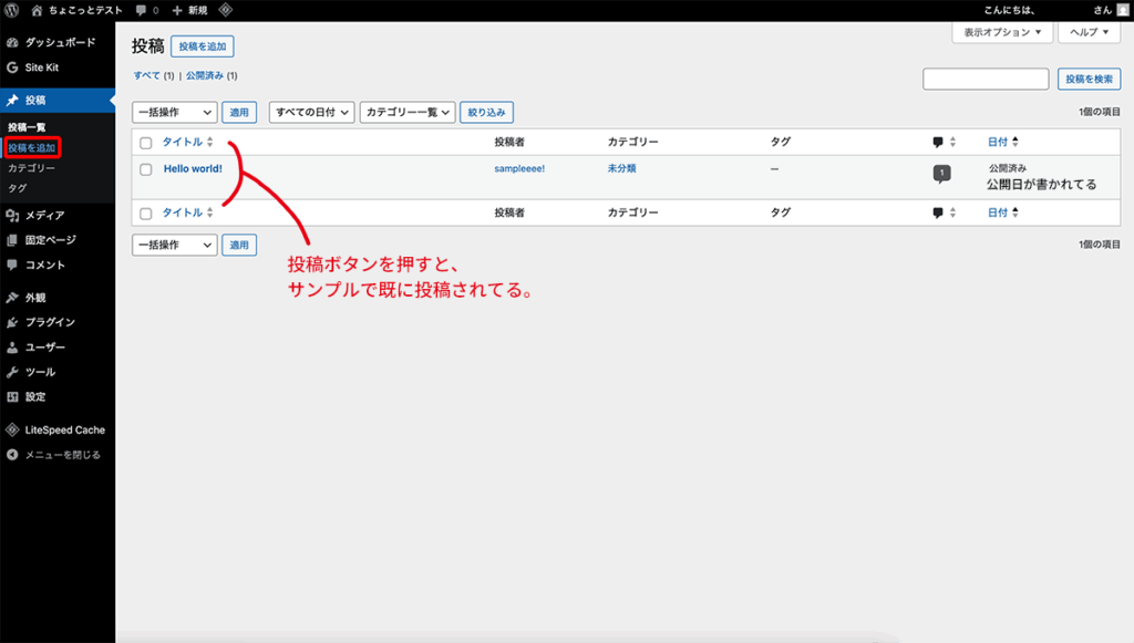 初回はサンプル投稿がありますが、これを後でいじっても消してもOKです。