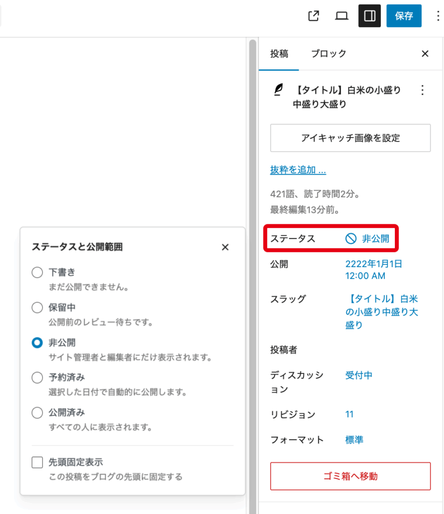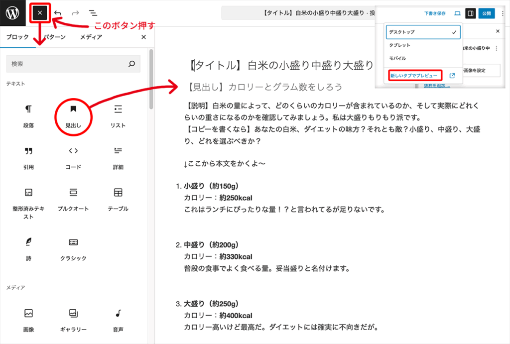 「下書き保存」を押し、「新しいタブでプレビュー」を選べば、仮の投稿画面を確認できます。